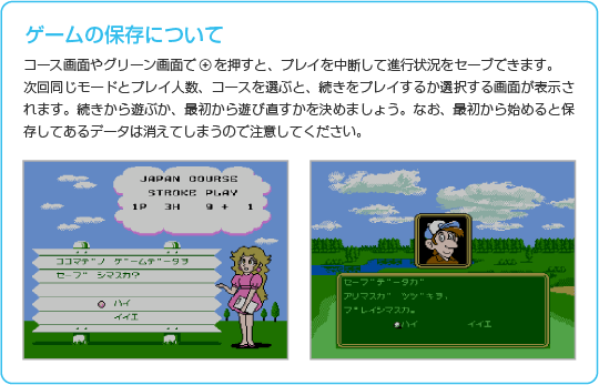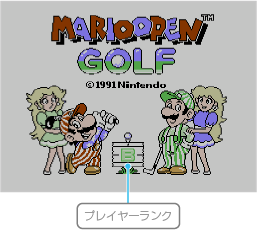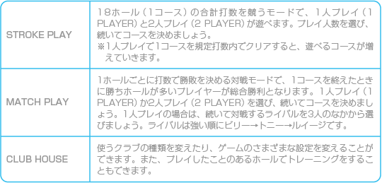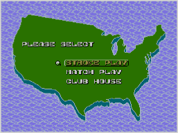 を押すと、ゲームモード選択画面に進みます。なお、タイトル画面のアルファベットはプレイヤーランクを表しており、「STROKE PLAY」モードの1人プレイでコースをクリアしていくとB(ビギナー)→A(アマチュア)→SP(セミプロフェッショナル)→P(プロフェッショナル)と変化していきます。