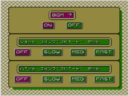 BGMのON/OFFやスイングスピードの初期設定、スピンの初期設定を決めることができます。それぞれ すべての設定が終わったら、「ケッテイ」にカーソルを合わせて |