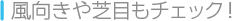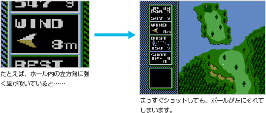 コース内に吹いている風は、ボールが飛ぶ方向に大きく影響します。コース画面の情報をよく見て、向きやクラブの選択を調整しましょう。 また、グリーンでは風の影響を受けない代わりに、芝目がボールの転がる方向に影響します。パットするときは、芝目のマークに気を配りましょう。 ![]() ![]() |