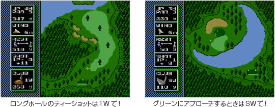 ショットの飛距離にもっとも大きく影響するのは、使うクラブの種類です。たとえば、グリーンまでの距離が長いときは打力のある「1W」を、距離が短いときは「SW」や「PW」を使うのが適しています。 なお、このゲームではグリーンまでの距離や状況に合わせて、自動的にクラブが選択されています。初めて遊ぶときは決められたクラブを選んで使い、慣れてきたら自分の使いやすいものに変更しましょう。 ![]() |