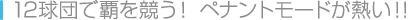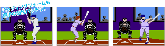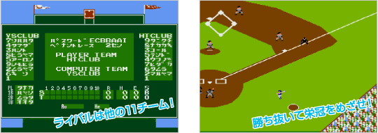 『燃えろ!!プロ野球』に登場する野球チームは全12チーム。1人用モードの「ペナント」では、好きなチームを率いて他の11チームと順番に対戦し、ペナントレースの優勝をめざすことになります。 個性あふれるさまざまなチームとの対戦は、プレイヤーを飽きさせません。 ![]() |