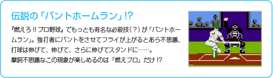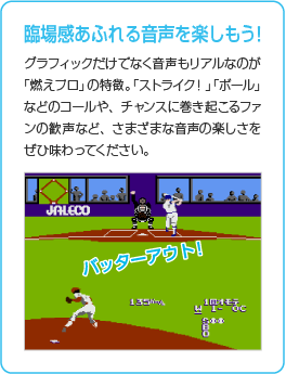 1987年6月26日に発売された『燃えろ!!プロ野球』は、多くの野球ファンをうならせた名作野球ゲームシリーズの第1作。当時の野球ゲームでは群を抜いているリアルなグラフィックと、独特のプレイ感覚で人気を博し、「燃えプロ」の愛称で親しまれました。 ![]() ![]() |
