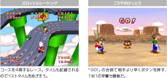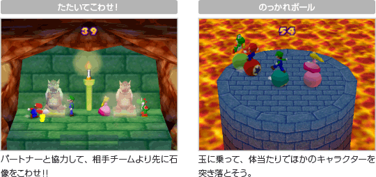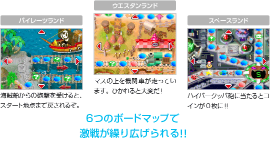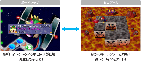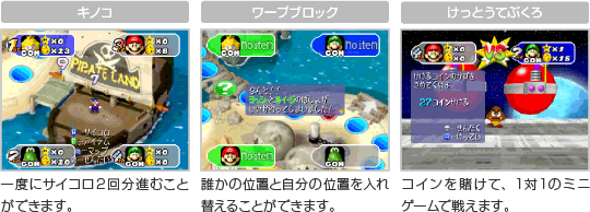 ボードゲームの目的は、ボードマップを移動し、ミニゲームで対戦して、ほかのキャラクターより多くのコインとスターを集めることです。ほかのキャラクターに負けないよう、いち早く目的の場所に向かい、ミニゲームに勝つことが大切になります。 ![]() ![]() |