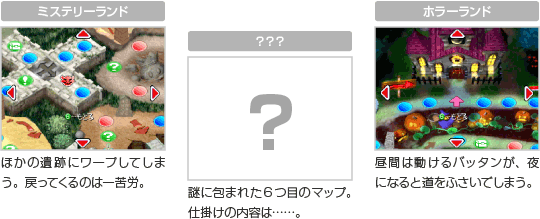 ボードゲームの舞台となるのは、以下の6つのテーマランドです。テーマランドごとに異なる仕掛けがあり、ハラハラドキドキの対戦を繰り広げることになります。 ![]() ![]() |