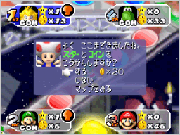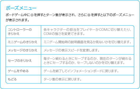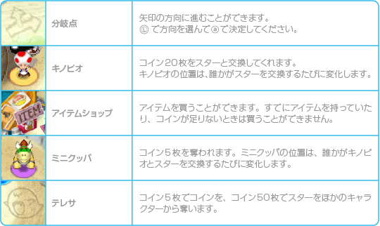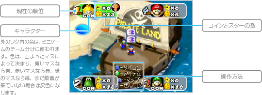 ボードゲームは、ボードマップでキャラクターを移動させ、ミニゲームでほかのキャラクターと戦って進めていきます。プラスマスに止まったり、ミニゲームに勝ってコインを集め、コインをスターと交換してください。ボードゲームが終了したときに、スターをもっとも多く集めていたキャラクターが勝ちです。 |