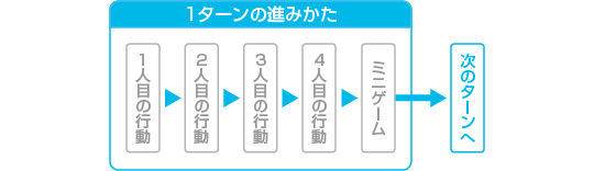 ボードゲームはターン制で進みます。1ターン内では、ボードマップでの移動と、ミニゲームを行います。ゲーム開始時に決めたターン数が経過すると、結果発表です。 |