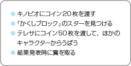 順位発表後、集めたコインがコインボックスに回収されます(スターは1個につきコイン50枚になります)。回収されたコインは、「ミニゲームランド」でミニゲームを購入するときに使ってください。 |