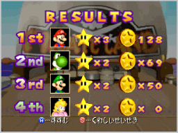 順位は持っているスターの数で決まり、スターが同数の場合はコインの枚数をくらべます。コインの枚数も同じ場合は、サイコロブロックを叩いて、表示された数字が大きいキャラクターが勝ちです。 |