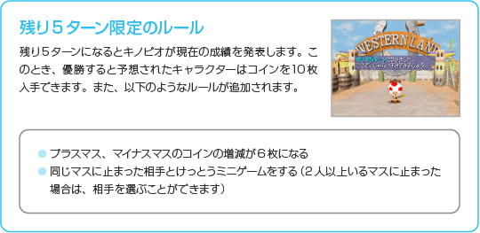 ミニゲームが終了すると、勝利キャラクター(チーム)が発表され、勝ったキャラクターはコインを10枚入手できます。引き分けの場合は誰もコインがもらえません。ミニゲーム中に手に入れたコインは、勝敗に関係なく入手できます。 |