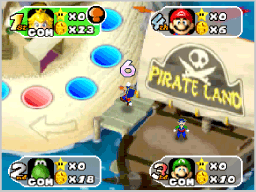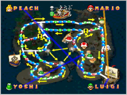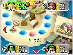 ミニゲームのチーム分けは、そのターンに止まったマスにより決まります。青色のマスなら青、赤色のマスなら赤のチームになります。緑色のマスに止まっている場合、自動的にどちらかのチームに分けられます。チームの分かれかたによってミニゲームの種類が自動的に決まります。 |