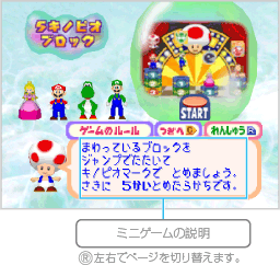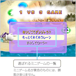 全員の行動が終了するとミニゲームになります。ミニゲームが始まる前にはミニゲームの説明画面が表示され、 ※ミニゲームの説明画面はポーズメニューの「ミニゲームのきりかえ」で非表示にすることもできます。