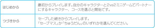 「ミニゲームコースター」は1人プレイ専用で、自動的に選ばれたミニゲームを順番にクリアしていくモードです。以下のいずれかのメニューを選んでゲームを始めてください。 ![]() |