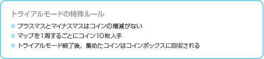 専用のボードマップを使って、事前に決めたターン終了時のコインの枚数を競います。プレイヤーの人数とCOMの強さを決め、ハンデを設定してください。ハンデは、ゲーム開始時に持っているコインの枚数になります。プレイするターン数を「さくさくプレイ」の10ターン、「ひょうじゅんプレイ」の20ターン、「とことんプレイ」の30ターンから選び、設定を確認するとスタートです。 |