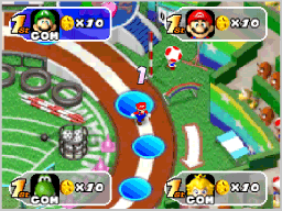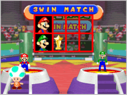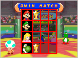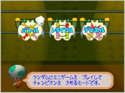 買ったミニゲームを自由に遊べます。最初にプレイヤーの人数と使用するキャラクター、COMの強さを決めてください。ミニゲームの種類→ミニゲームの順に選ぶと開始です。なお、4人対戦用ミニゲーム以外は「チームへんせい」で、チームの組み合わせも決めてください。