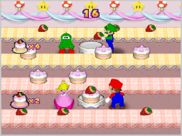 を押すとコンベア上の材料を持ち、放すと材料を置きます。1人はケーキのスポンジ、もう1人は上にのせるイチゴの担当となり、スポンジの上にイチゴをのせるとケーキの完成です。制限時間内に多くのケーキを完成させたチームの勝利です。