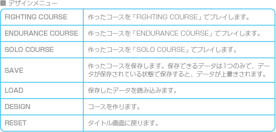 タイトル画面で「DESIGN」を選ぶとデザインメニューが表示されるので、以下の項目から選びましょう。