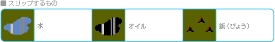 触れるとスリップするものと、クラッシュするものの2種類あります。スリップしたときは滑った方向にハンドルを切ると体勢を立て直すことができます。