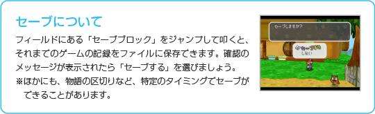 マリオを操作してフィールドを冒険し、キャラクターと話したり、さまざまなしかけを解きながら物語を進めていきましょう。 途中で敵に触れるとバトル画面になり、敵との戦いが始まります。 |