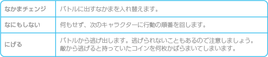 なかまの入れ替えやバトルからの逃走など、攻撃以外のさまざまな行動ができます。