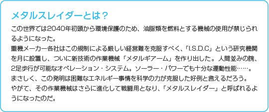 西暦2062年。 長きにわたる大規模な戦争が終結して8年が経過し、地球圏の人々は、ようやく平和を日常のものとして感じられるようになっていた。 日向 忠は、ガールフレンドのエリナ・ファーファとともに、さまざまな機械のオペレートを引き受ける仕事をしている。 ある日、作業所の隣にある「GEN'S AUTO」の店主、ゲン・ランクルの薦めで購入した作業用メタルギアームに試乗すると、突然作業機械はその姿を変えた。それは巧妙に偽装された軍事用のメタルスレイダー「グローリー」だったのだ。そして、その記憶回路には謎のメッセージが残されていた。 「創造主を探せ……地球は危機に瀕している……」 メッセージの意味を解明するため、忠と妹のあずさ、エリナの3人は、コックピットに残されたディスクを手がかりに宇宙へ旅立つ。 やがて、彼らは封印されていた真相と、宇宙をめぐる恐るべき陰謀を知ることになるのだった……。 ![]() |