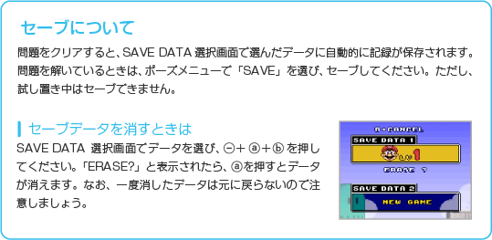 で決定してください。ここで選んだデータにゲーム中の記録を保存します。すでにデータが保存されているデータを選ぶと、続きから始めることができます。