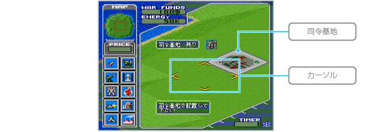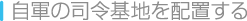 司令基地はゲームの勝敗にかかわる重要なユニット(基地や設備などを表すコマ)です。戦いの前に、3つの司令基地をフィールド上に配置しましょう。 ![]() |