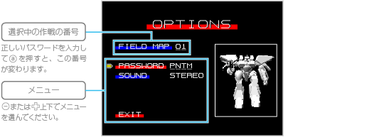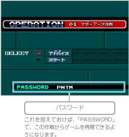 以前にプレイしたときパスワードを控えてあれば、続きの作戦からプレイできます。下の画面が表示されたら、メニューから「PASSWORD」を選んで なお、この画面ではメニューから「SOUND」を選んで ![]() |