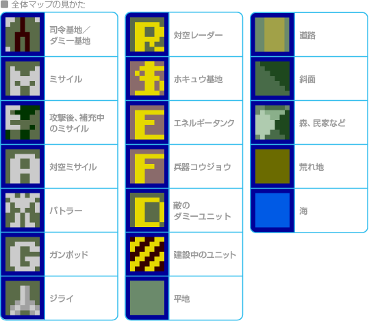 ![]() ![]() ![]() ※レベルアップしたバトラーやミサイル、対空ミサイルはアイコンが茶色に変わります。 |
