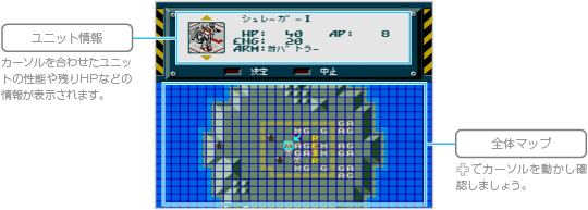 ユニット配置以外にも、これらのコマンドでさまざまな行動を行うことができます。 なお、「ユニットデータ」で全体マップを確認する間や、「敵をこうげき」で攻撃準備をする間はゲーム中の時間が進みません。 |