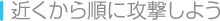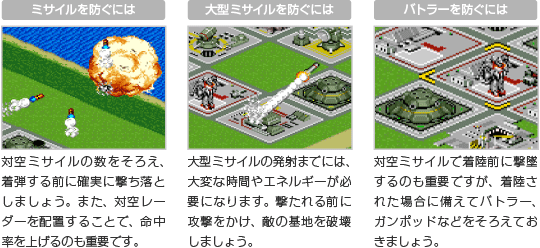 攻撃目標を決めるときに敵軍陣地の奧をねらってしまうと、多くの対空ミサイルを浴びてしまい、途中で撃ち落とされる可能性が高くなります。まずは自軍陣地に近い場所から攻撃し、相手の反撃を弱めながら敵軍陣地の奥深くをねらっていきましょう。 |