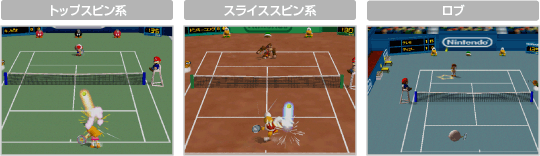 実際のテニスと同じように「トップスピン系」「スライススピン系」「ロブ」「ドロップ」「スマッシュ」のショットを打つことができ、これらは 難しい操作を覚えなくても、誰でも手軽に本格テニスを楽しむことができるのです。 ![]() ![]() |