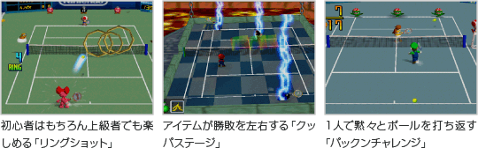 『マリオテニス64』では通常のテニスはもちろん、コート上のリングにボールを通しながらポイントを稼ぐモードや、アイテムを使ったハチャメチャなテニスを楽しめるモード、次々に飛んでくるボールをひたすら打ち返すモードなど、いろんなモードがあります。 プレイ人数やそのときの気分などで、いろんなテニスを楽しむことができるのです。 ![]() |