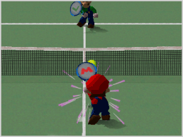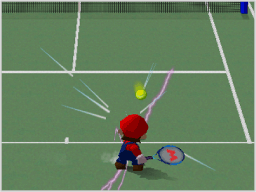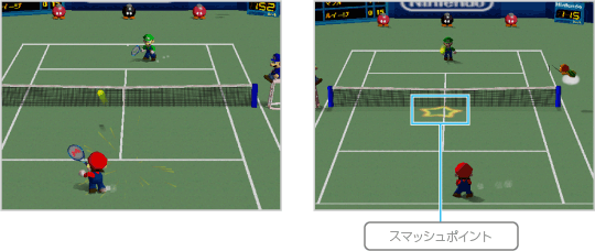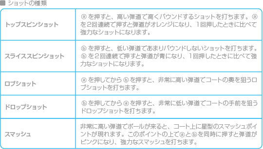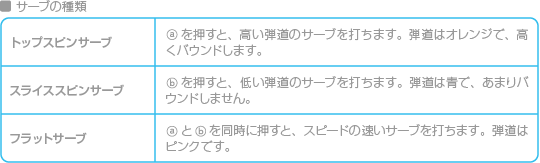 を倒した方向に応じてサーブで狙う相手コートの位置を決めることができ、押したボタンに応じて以下の3種類のサーブを打つことができます。