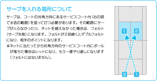 ※サーブを打ち返すときは、自分のコートにワンバウンドしてから打ち返してください。ノーバウンドで打ち返すと、相手のポイントになります。