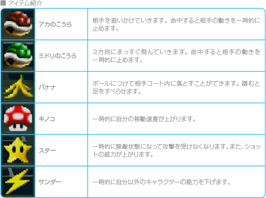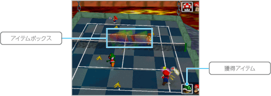 グラグラ揺れる不安定なコートで試合をします。コート内に出現するアイテムボックスにボールを当てると、アイテムを獲得できます。アイテムを使いたいときは