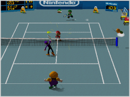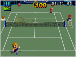 トーナメント形式の大会に参加し、優勝をめざします。試合形式やコートなどはトーナメントごとに決められているので、使用するキャラクターとシングルスとダブルスのどちらに参加するのかを選んでください 。 「キノコカップ(易しい)」「フラワーカップ(普通)」「スターカップ(難しい)」の3つのトーナメントがあり、最初は「キノコカップ」に参加します。優勝すると次のトーナメントに出場できます。 |