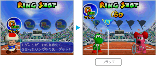 テニスの試合をしながら、コート上に出現するリングにボールを通して「リングポイント」をためていくモードです。1人でプレイするときは左下のような画面になり、勝利条件を「GAME」「TIME」「BALL」「POINTS」の4つから選べます。このときフラッグ(さらに詳しい課題)も選べます。2〜4人でプレイするときは、勝利条件が「RINGS」に固定されていて、目標のリングポイントのみ変更できます。 ![]() |