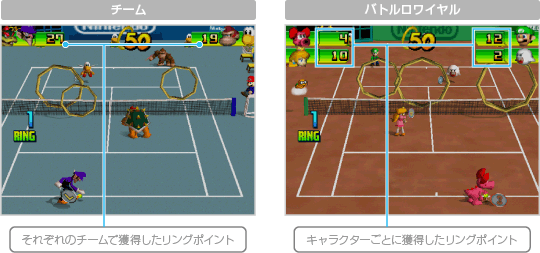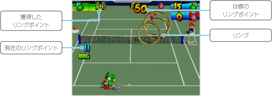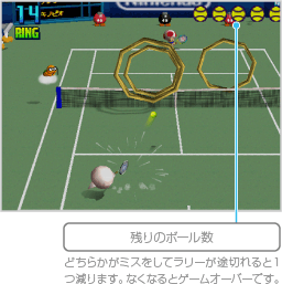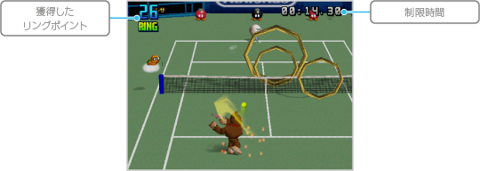 相手とラリー(打ち合い)を続けて、決められたボール数内に目標のリングポイントを集めます。相手が打ち返したときにリングを通した分のポイントも、獲得したリングポイントに加算されます。 |