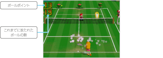 パックンフラワーから次々に放たれる50球のボールを相手コートに向かって打ち返し、「ボールポイント」を稼ぐモードです。相手コートにはおじゃまキャラクターがいて、打ち返したボールをボレーしようとしてきます。 打ち返したボールがボレーされずに相手コートに入ると、ボールポイントになります。 ![]() |
