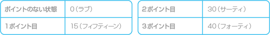 ポイントの呼びかたは以下の通りです。4ポイント目を取ったプレイヤーのゲームとなります。 ![]() |