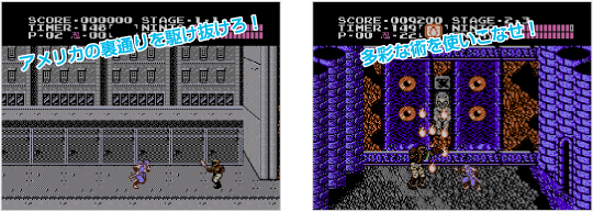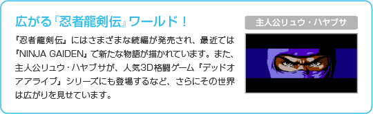 1988年12月9日に発売された『忍者龍剣伝』は、「リュウ・ハヤブサ」を主人公とする横スクロールアクション。 バラエティ豊かなステージが用意された歯ごたえのあるアクションシーンと、ドラマティックなビジュアルシーンの組み合わせで人気を博しました。 ![]() |