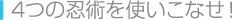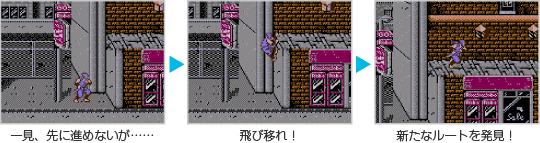 ステージに落ちている「パワーアップアイテム」を拾うことで、リュウはさまざまな忍術を身につけます。 忍者の基本「手裏剣」から、恐るべき秘術「炎波の術」まで、4つの忍術を状況に応じて使い分けましょう。 |