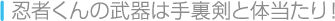 忍者くんは、手裏剣を武器に敵と戦います。また、ジャンプを駆使して敵に体当たりすると、気絶させることもできます。この体当たりと手裏剣を組み合わせて使い、襲いかかってくる敵と戦いましょう。 ![]() |