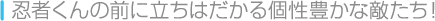 各シーン(ステージ)には、黒子やだるまを始め、個性豊かな敵がたくさん登場します。また、敵によって攻撃方法が異なり、さまざまな武器を使って忍者くんに襲いかかります。どうやったら倒せるか、考えながら進みましょう。 ![]() |