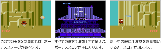 ゲームに慣れてきたら、ただ敵を倒すだけでなく、ハイスコアも狙ってみましょう。ハイスコアを狙うには、宝の玉を集めてボーナスステージをプレイしたり、敵をすべて手裏剣1発でしとめたり、一度倒して落下していく敵に再度手裏剣を当てるなどの方法があります。ぜひ試してみてください。 ![]() |