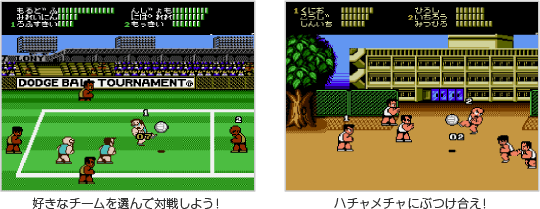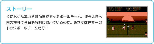 | 1988年7月26日にファミリーコンピュータ用ソフトとして発売された『熱血高校ドッジボール部』は、同名のアーケードゲームをアレンジして移植したアクションゲームです。主人公「くにお」をはじめ、チームメイトの「ひろし」や「こうじ」など個性的なキャラクターたちが、スポーツに舞台を移して活躍します。 | ![]() |
