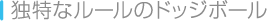 普通のドッジボールのルールでは、内野手がボールに当たると外野に出ますが、本ソフトのルールは一味違います。ボールに当たると体力が減り、すべてなくなると失格になってしまうのです。くにおくんシリーズらしい独特なルールのドッジボールを楽しんでください。 |