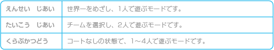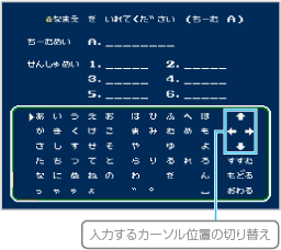 を押すと右の画面が表示され、各モードのチーム名と選手名を変更できます。名前を入力したら「おわる」を選んで2P側の名前を入力し、もう一度「おわる」を選んでゲームモード選択画面に戻りましょう。