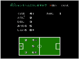 ポジションを変更するときは「はい」を選び、1(キーパー)からポジションを決めていってください。操作できるキャラクターは、「I」と表示されたキャラクターです(2Pの場合は「U」が操作キャラクターです)。ほかのキャラクターは試合中操作できませんが、指示を出すことができます。 |