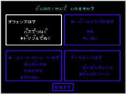 オフェンスやディフェンスの方針や、キーパーの攻撃の有無など、試合での作戦を決めることができます。